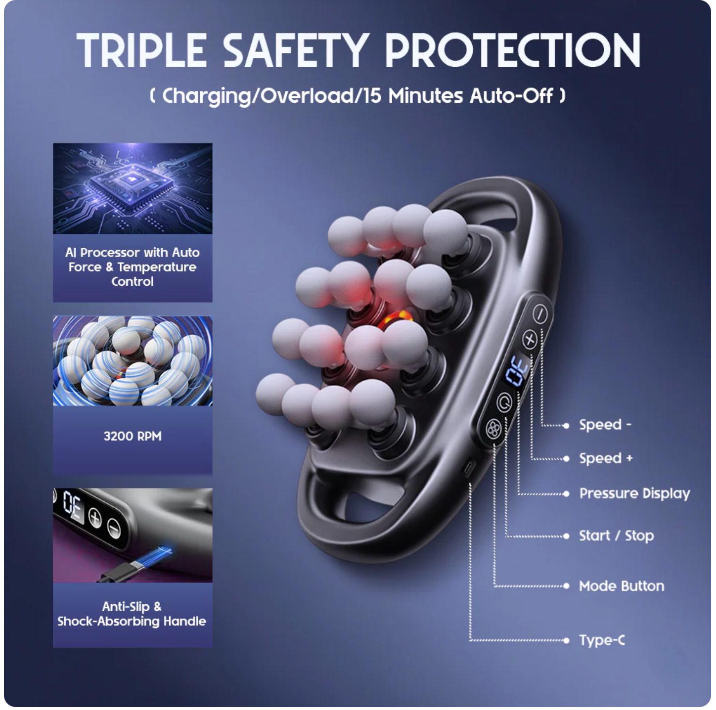 FeelFlow™ features an intuitive control panel that lets you adjust speed, pressure, and massage modes with one touch, while the built-in display shows real-time settings for full control. A smart processor manages force and temperature, delivering up to 3200 RPM with stable performance. Combined with Type-C charging, an anti-slip shock-absorbing handle, and triple safety protection — including overload control and 15-minute auto shut-off — FeelFlow™ is designed for powerful, safe, and effortless use.